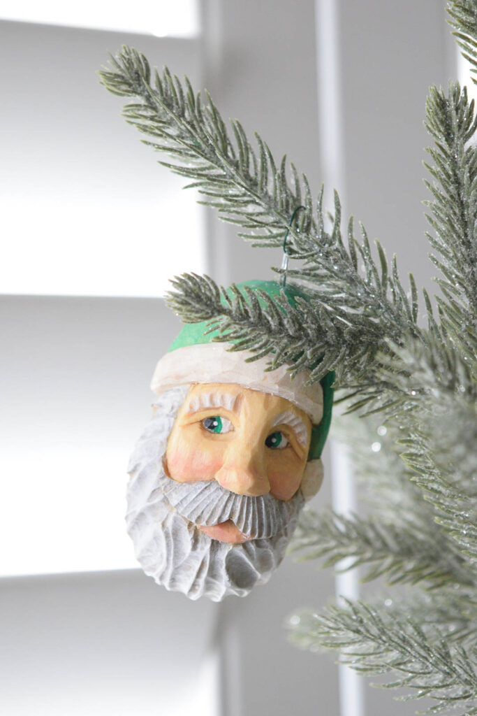 I’m not exaggerating when I say my dad may carve multiple Santa Clauses in a week! He’s started making these little Santa faces that are full of personality and detail. When I visited this summer he pulled out a cardboard box FULL of Santa faces and told me to take what I wanted.