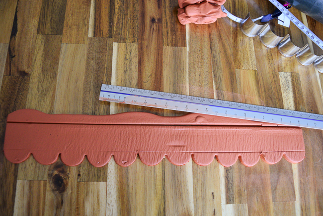 From the bottom indention, line up the upper part of your scallop edge cookie cutter and cut the length you need. I needed to make several cuts in a row. Line them up so it looks like a perfect pattern.