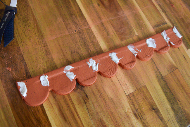 Put vertical swipes of Aleene’s tacky glue every inch or so along the trim. Make sure to get both edges well-covered.