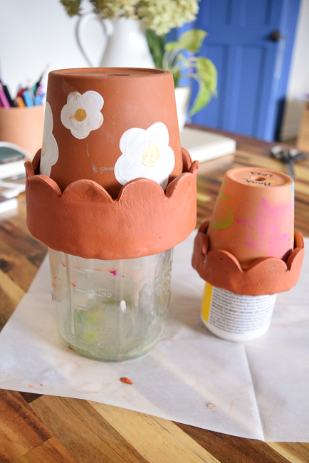 This is also one of those great quickie crafts. Most of the supplies will be things you’ve already got and it only takes about half an hour to make a couple of scallop edge terracotta pots. And, if you’ve got older kids, I think you could even have them help out.