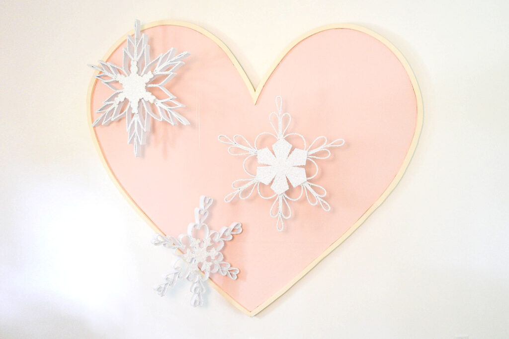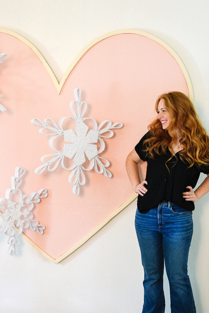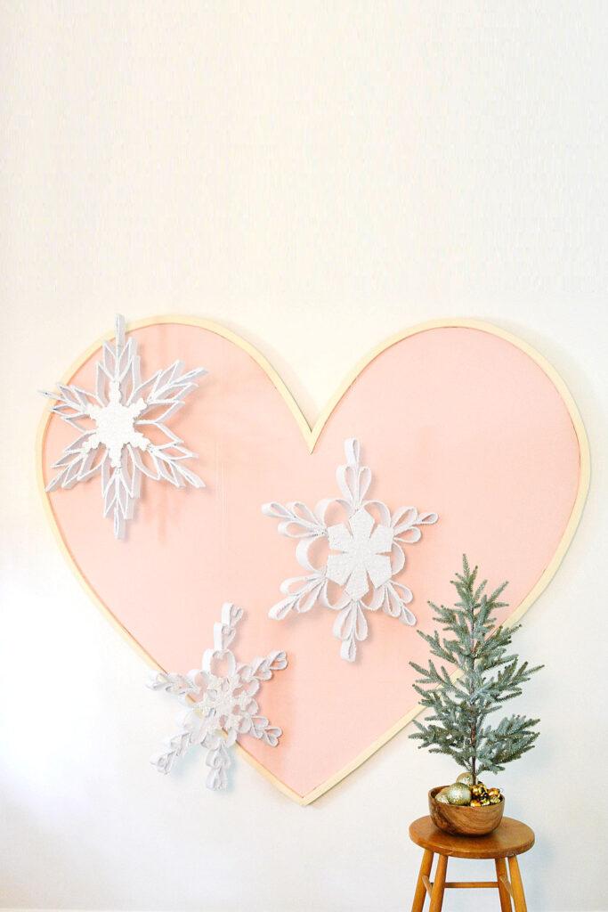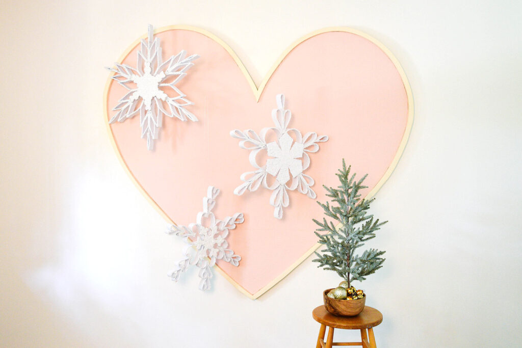 This giant heart is one of the best things I’ve ever added to my office! It’s so cheerful, and it makes for a great background in photos. I’ve been steadily using it as a kind of installation base to stretch myself beyond Christmas tree décor. This giant snowflake heart install might be my favorite design yet.