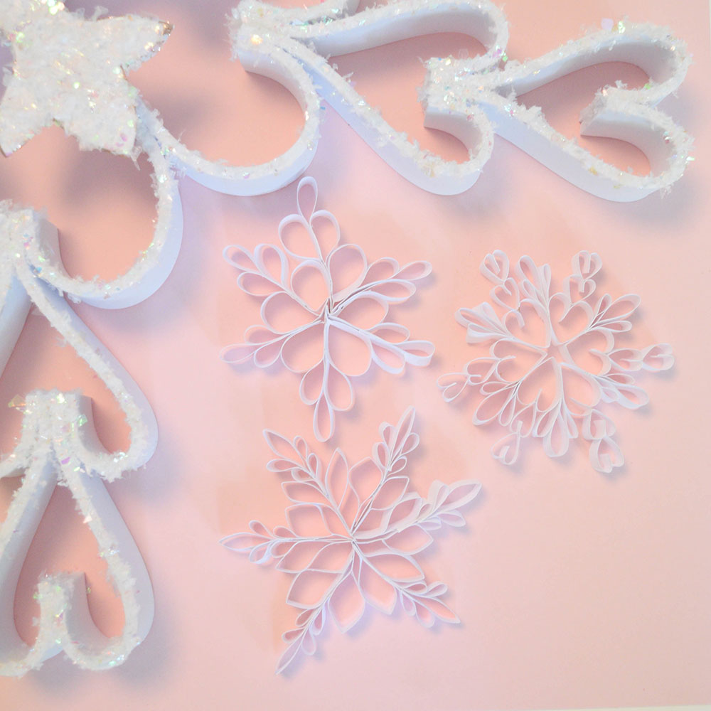 My favorite part of the process! You’ve done the hard part, so now go wild. Or reserved. Whatever works for you! I decided to go with a mixture of faux snow and chunky iridescent glitter to add some texture to my snowflakes and hide the mechanics of how they’re made. Liquid gold foil paint would also look amazing!